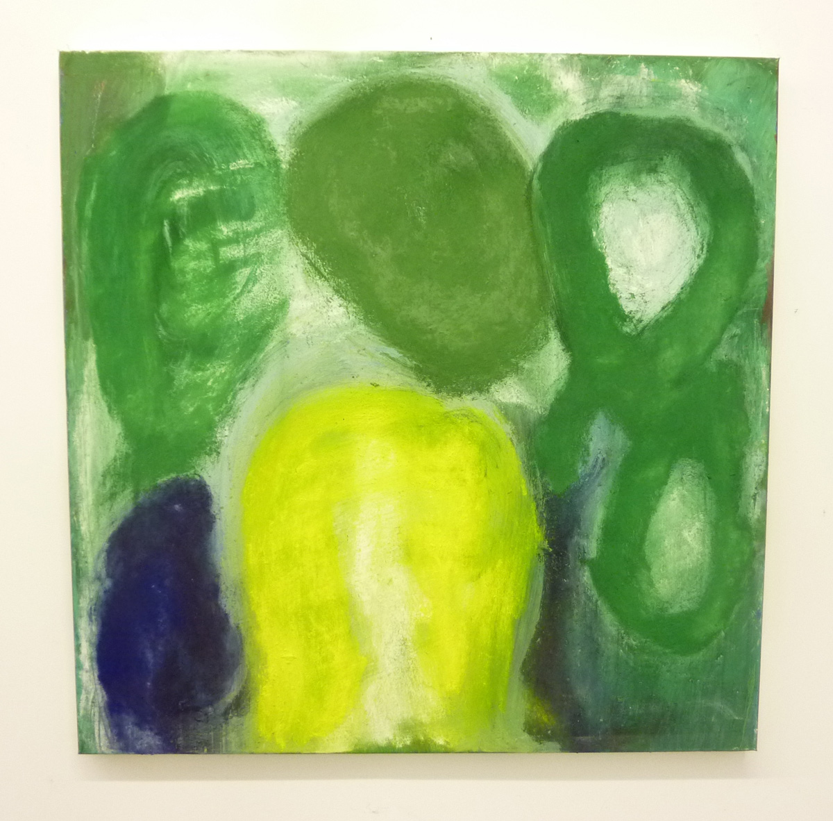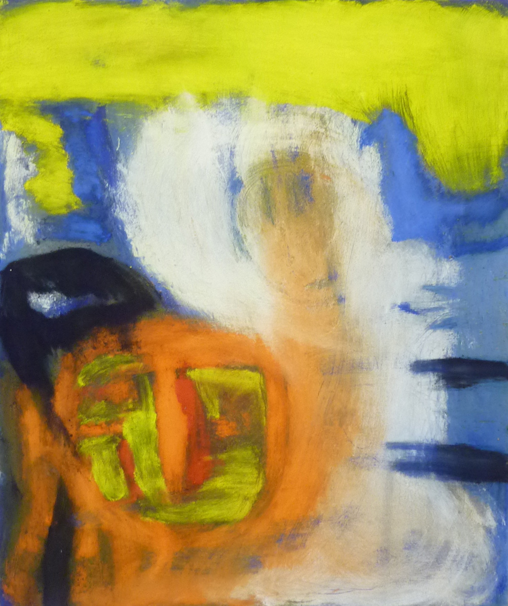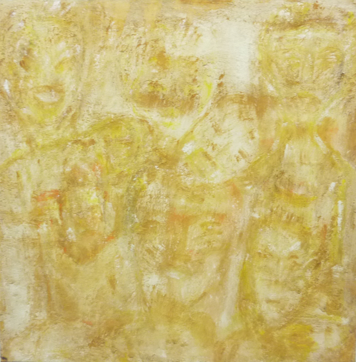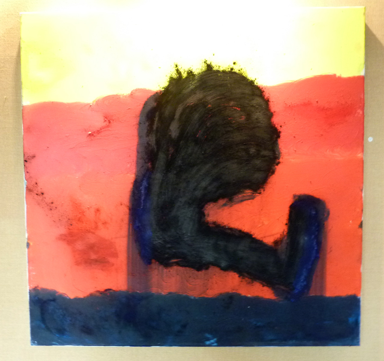 Après, j’ai rencontré l’artiste et ses toiles. Les toiles d’Anne-Marie Gbindoun naissent de la juxtaposition de plusieurs couches de peinture à l’huile et de pigments purs jetés directement sur la toile, entre lesquelles, plus ou moins discrètement, on voit surgir des figures humaines.
