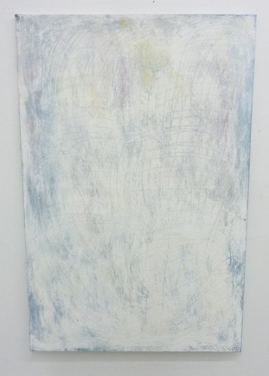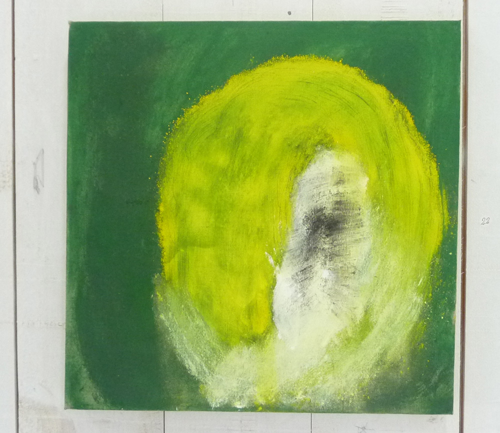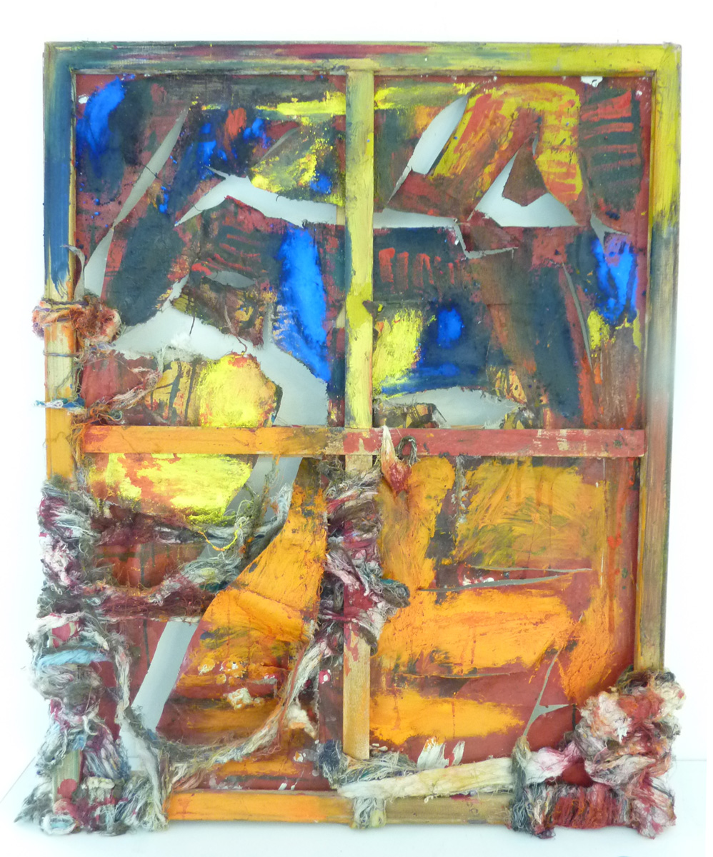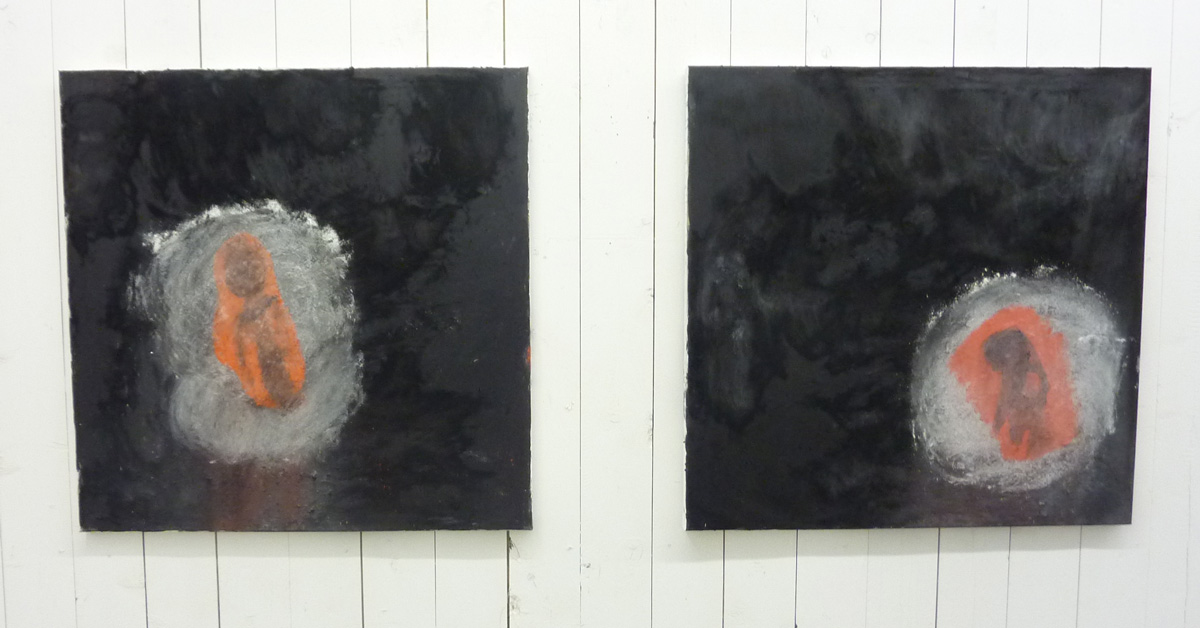 Après, j’ai rencontré l’artiste et ses toiles. Les toiles d’Anne-Marie Gbindoun naissent de la juxtaposition de plusieurs couches de peinture à l’huile et de pigments purs jetés directement sur la toile, entre lesquelles, plus ou moins discrètement, on voit surgir des figures humaines.